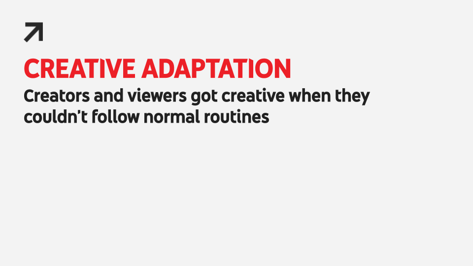 With traditional sports sidelined, people also sought out a range of content that, to some degree at least, filled the void left by the loss of these communal cultural experiences. MrBeast’s live-streamed rock paper scissors tournament was a creative twist on collaboration by creators who were not able to physically meet. Another similarly quirky sports entertainment – marble racing as an Olympic sport – caught on in March. By May, John Oliver had decided to sponsor Jelle's Marble Run's elaborate spectacles and the channel has since passed one million subscribers.