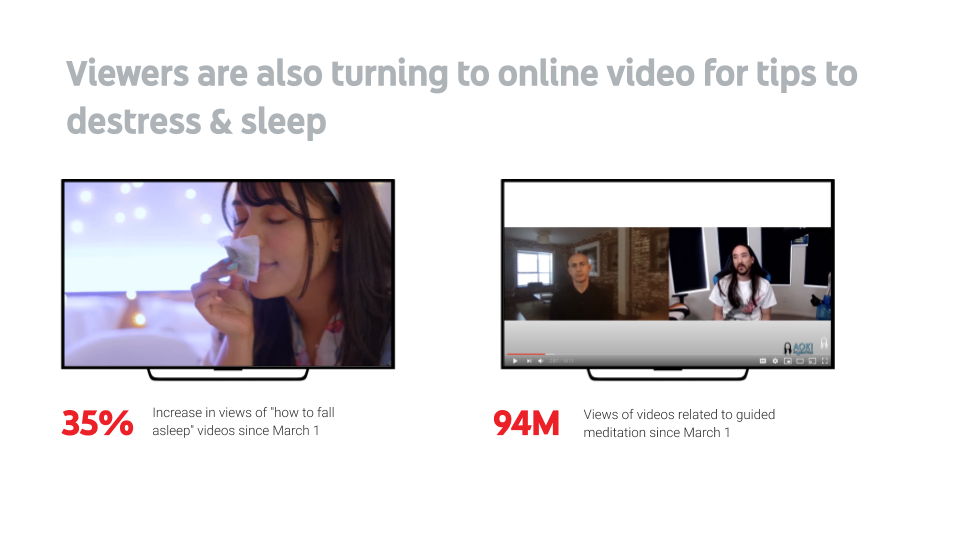As we remained homebound, videos that provided tips for falling asleep began to take off. Average global daily views of videos with "how to fall asleep" in the title have increased by over 35% since April 1st when compared to their prior average for the year.