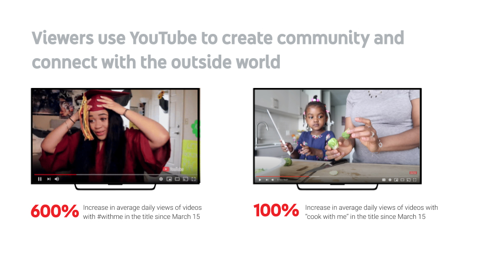 Viewers continued to use YouTube to connect with creators performing everyday tasks. Average daily views of videos with "cook with me" in the title have increased by over 100% since March 15th compared to their average views for the rest of the year. Average daily views of videos with #withme in the title have increased by 600% since March 15th compared to their average views for the rest of the year.