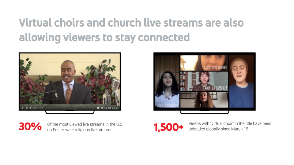When performers could no longer come together to create music, they united over video instead. These collaborative videos allowed people who are part of choirs to continue to harmonize through the computer. Since March 15th, over 1,500 videos with “virtual choir” in the title have been uploaded globally. Meanwhile, with churches unable to open their doors to their congregations, YouTube allowed viewers to maintain a connection to those institutions. More than 30% of the most-viewed live streams in the U.S. on Easter were religious live streams.